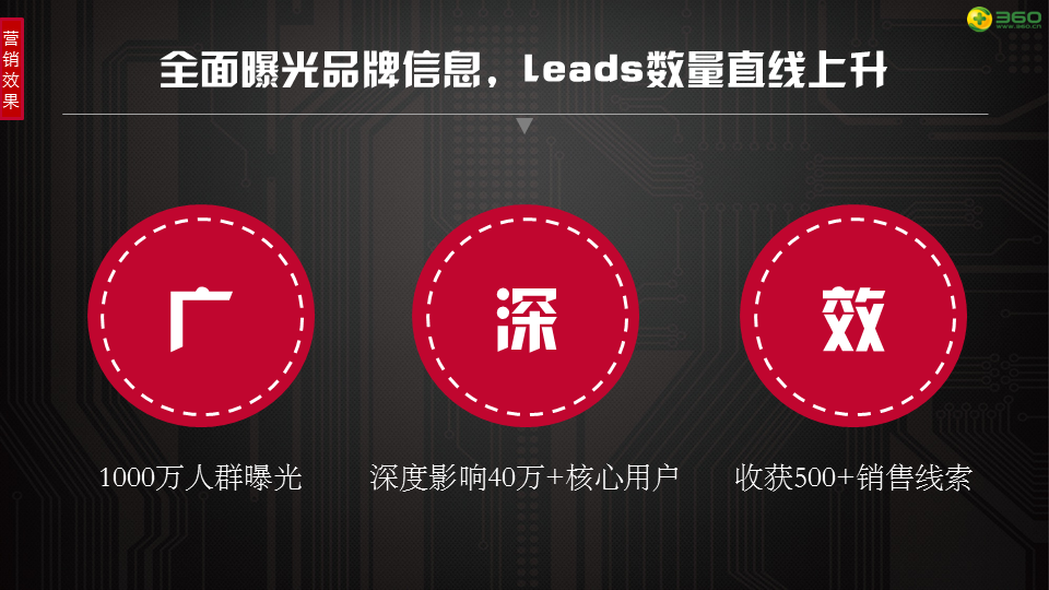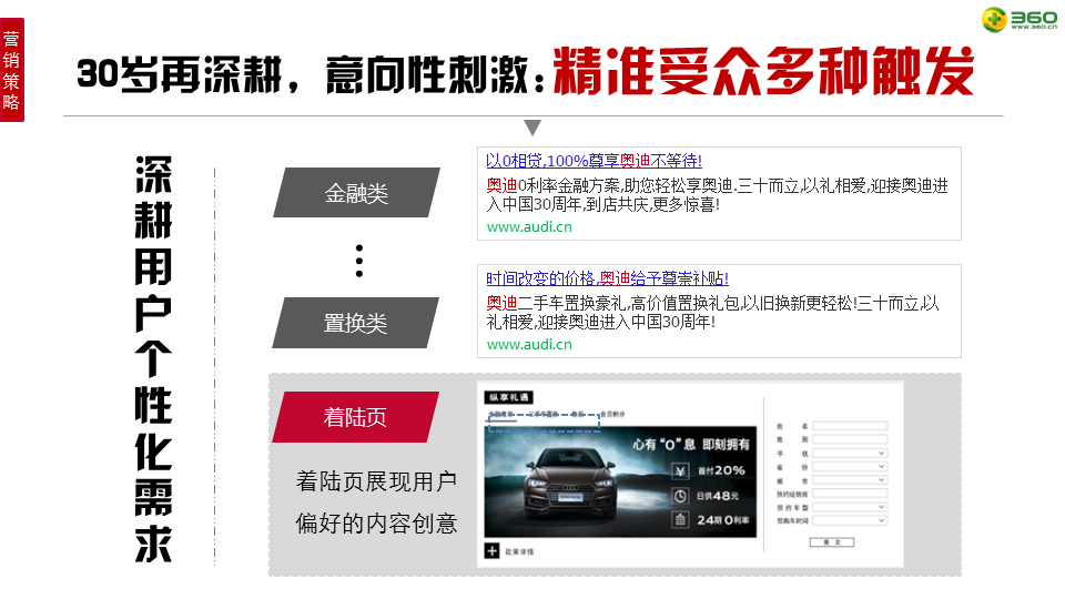 运用360导航开屏及安全卫士开机小助手大曝光资源,精准定向奥迪兴趣人群及汽车兴趣人群,全面曝光活动信息塑造品牌形象。关键词品牌直达及线索收集样式提升线索转化。